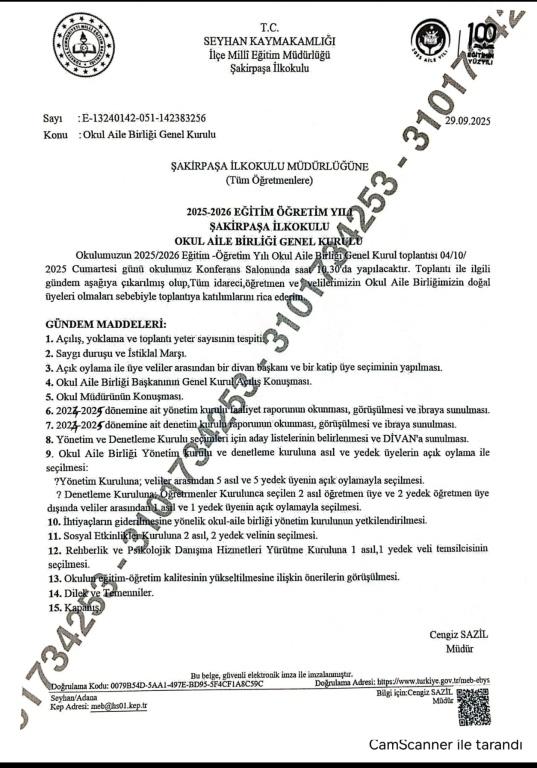 Şakirpaşa İlkokulu 2025-2026 Eğitim-Öğretim Yılı Okul Aile Birliği Toplantısı ~ Gündem Maddeleri
